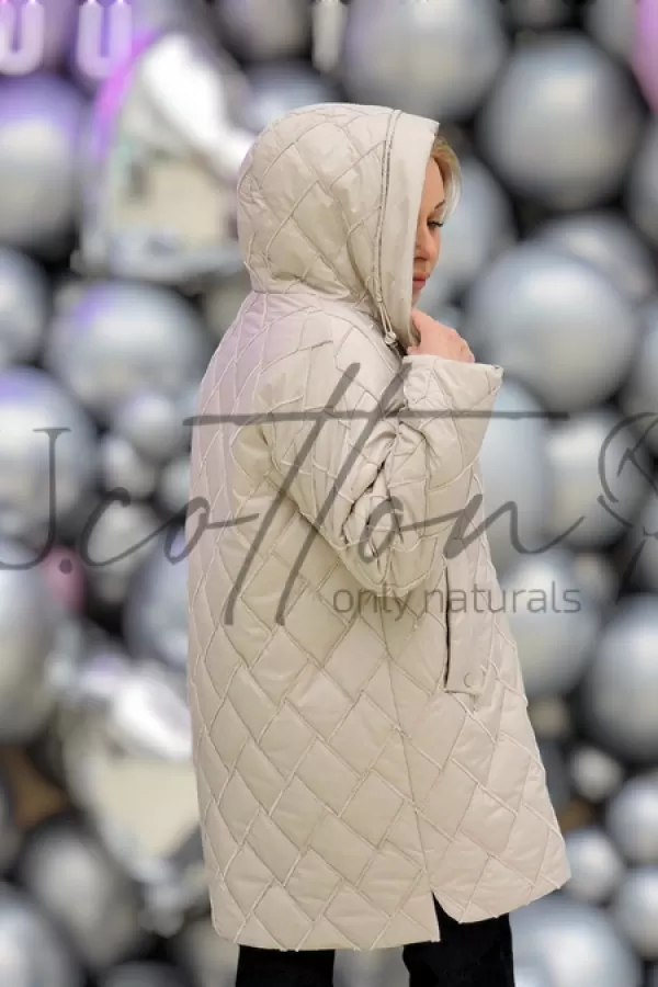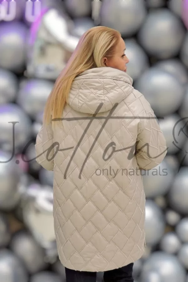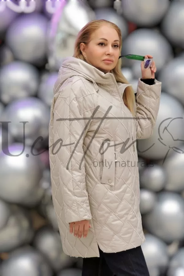 Свіже дизайнерське рішення весни-2024 - демісезонна куртка від бренду U.Cotton, стильний кежуал в трьох кольорах. Відмінна риса - фантастична текстура: водонепроникна тканина неочікувано оторочена оксамитом (велюром) у формі ромба. Сталевий блиск і ніжна хутряна облямівка в одному коктейлі перетворюють куртку на справжню перлину прет-а-порте. У цієї моделі від Ю.Коттон чимало і інших "родзинок" - якісна фурнітура з помітним зухвалим декором, великий крутий капелюх, стильні манжети, ефектні закруглення по швах тощо.