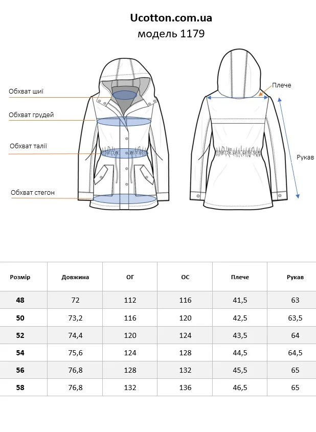 Розміри - 48-58 (ОГ від 112 до 138 см, ОС - від 116 до 136 см)