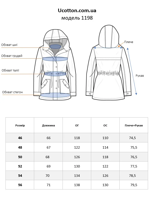 Фасон - сучасний модерн, гідний рок-зірки на дозвіллі - коротка куртка до середини стегон, зручна у використанні мобільними жінками, якісна фурнітура, стильні рішення з блискавками і кнопками і, як головна фішка, - обробка капюшона та кишень стильною вафельною саржою!