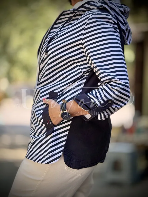 Розкішна кежуальна кофта-вітровка виконана із цілком натуральної тканини (коттон, бавовна). Класичний і в той самий час сучасний дизайн фасону Морячка, який завжди освіжає, завжди додає спортивності, бадьорості, робить річ фантастичною, а жінку в ній - зухвалою і ошатною. Зацініть якісну фурнітуру, кишені, манжети, капелюх.