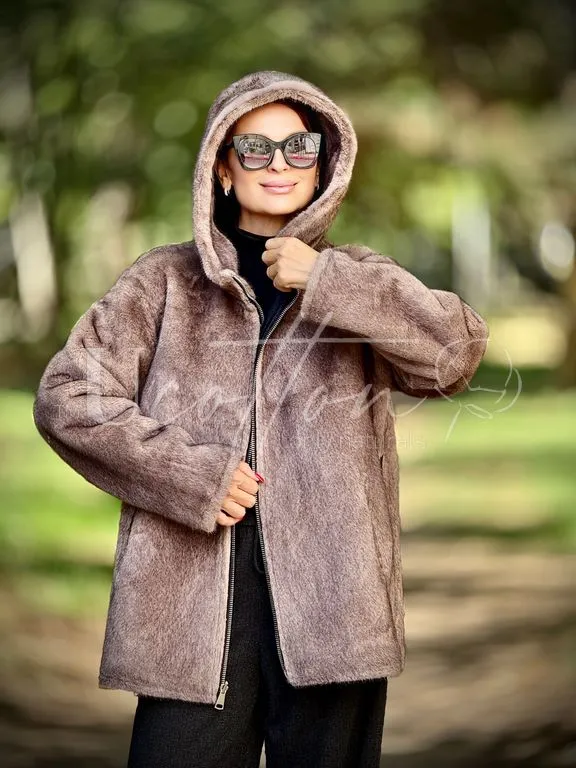 Другий бік - фантастично ніжне, оксамитове екохутро. Текстура хутра - еконорка з трьома шарами різного ворсу (відтвореного, як в природі, тільки без жертв) від підпуші до криючого волосся, яка лицьовою стороною зробить вас ошатно елегантною, а навиворіт зігріє в будь-яку погоду! Колір екохутра - Молочий Шоколад, колір какао, стриманий горіхово-рожевий.