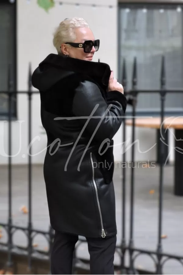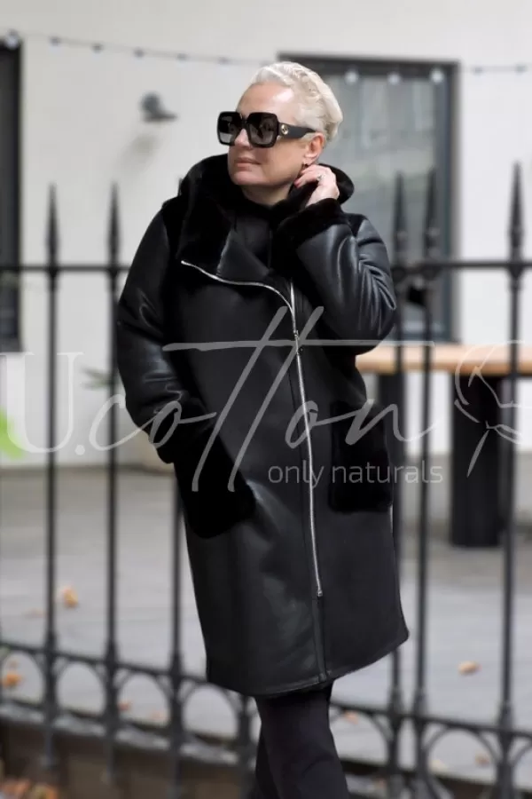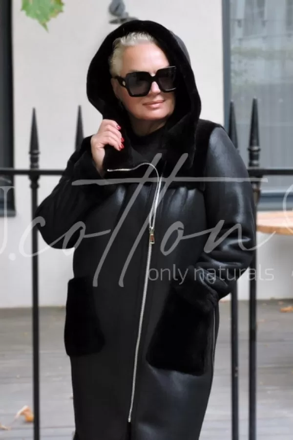 Дублянка класична чорна подовжена з накладними хутряними кишенями
