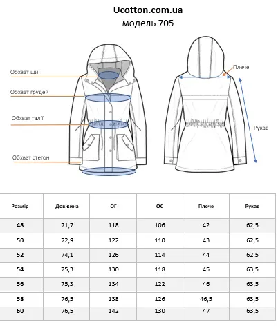 Модель 705 у розмірах 48-60 (ОГ від 118 до 142, ОС - від 106 до 130 см)